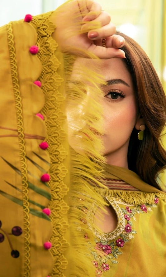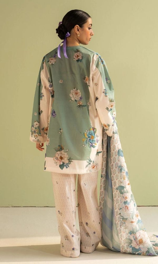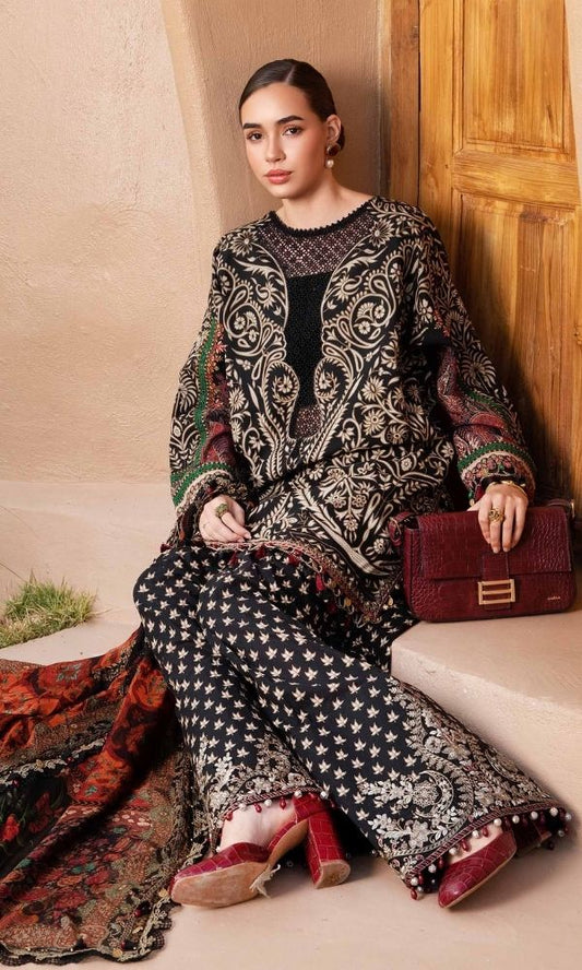 lawn 3pc unstitched heavy embroidered suit with silk digital printed dupatta