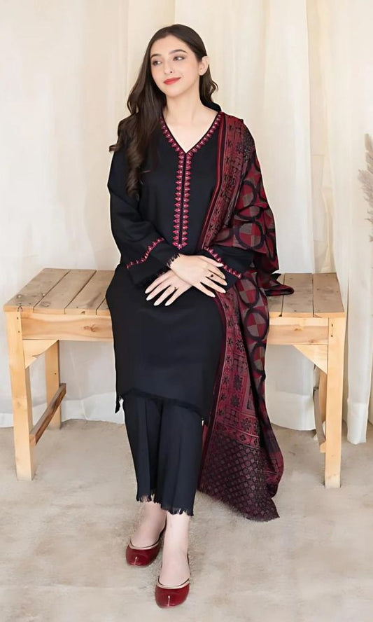 Dhanak 3pc unstitched heavy embroidered suit with poly woolen shawl