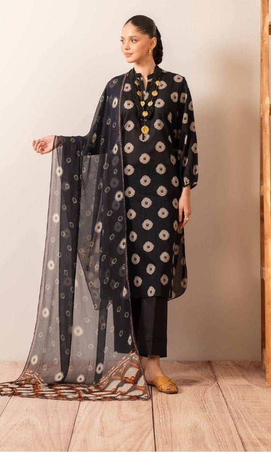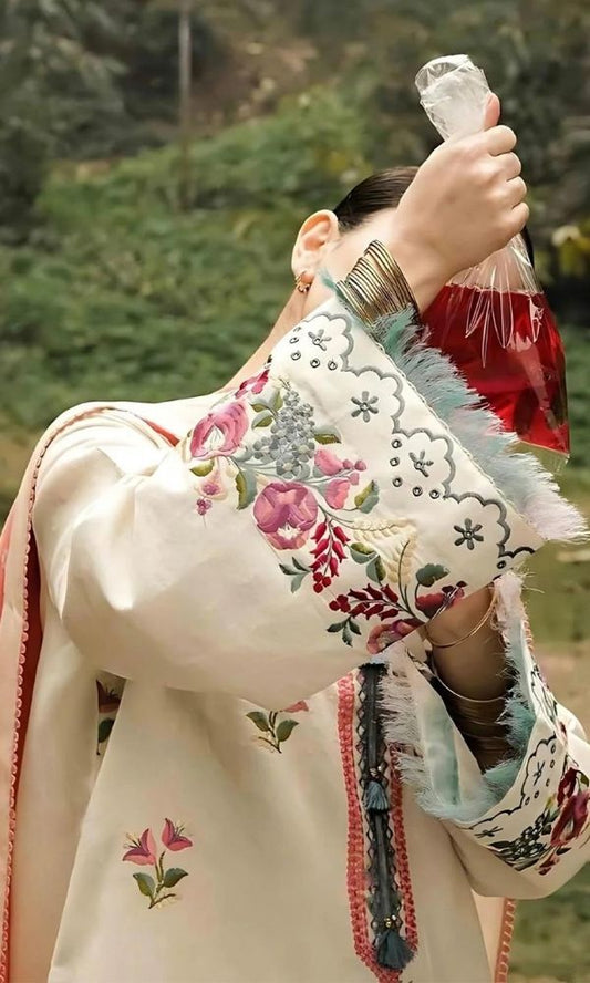 Dhanak 3pc unstitched heavy embroidered suit wit patches and motives and khaadi jaqaud dupatta